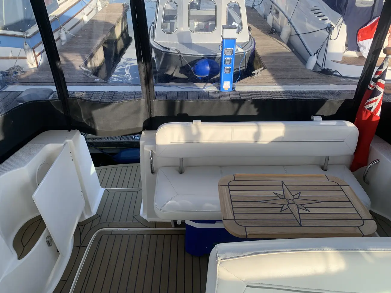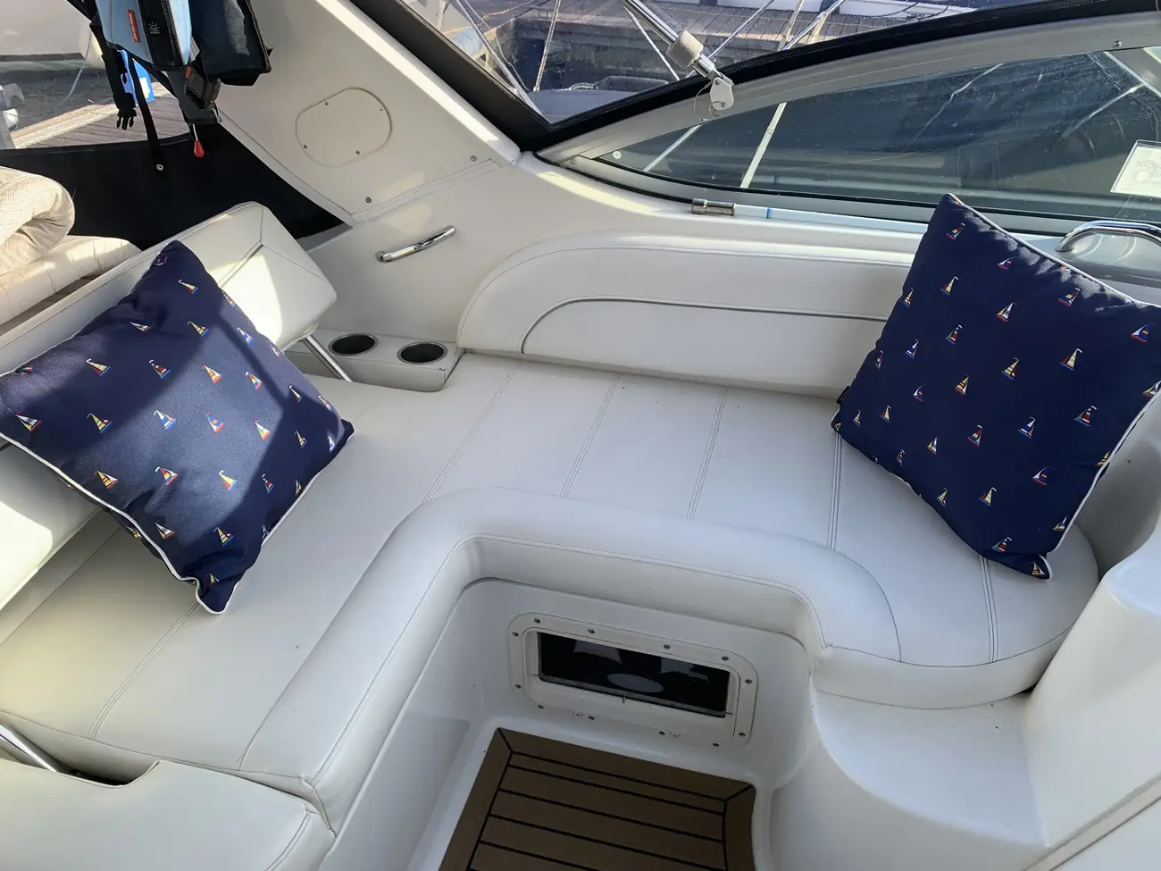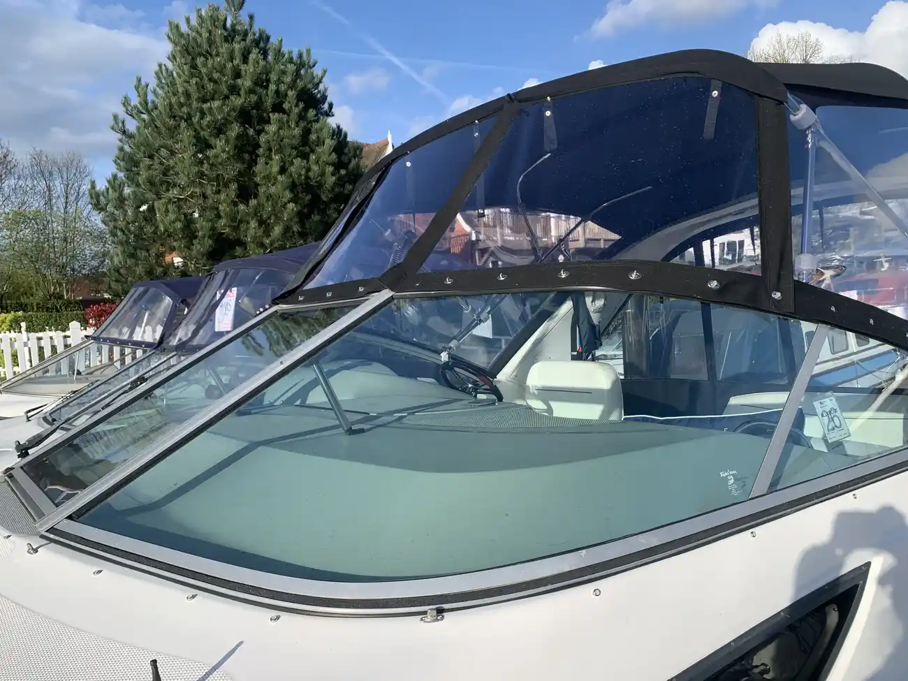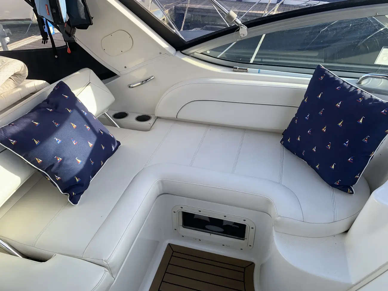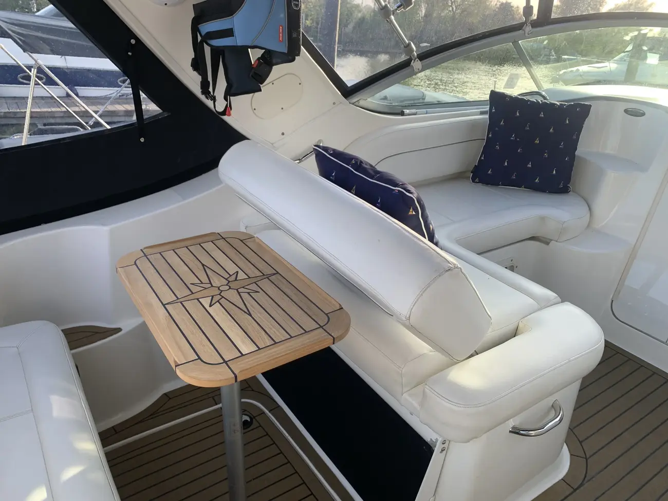 Further specification includes: bow thruster, Garmin GPSmap 556s, Garmin VHF 100i radio telephone, compass, horn, full engine instrumentation, trim tabs, electric bilge pump, Kenwood radio/stereo with speakers, teak cockpit table, cockpit drink holders throughout, Norcold fridge, Origo 2-burner hob, Contoure microwave oven, hot and cold pressurised water via calorifier, Kenwood DNX7200 navigation system, Sniper TV, Weems & Plath clock, electric flush toilet with waste tank, hot and cold pressurised water in head sink with pull out shower, teak effect flooring on bathing platform & cockpit, full adjustable cockpit canopy, Lewmar electric anchor windlass, anchor and chain, battery charger, full 240v shore support, spotlight, navigation lights, windscreen wiper, folding windscreen to bow, bathing ladder to water, shore power inlet, warps and fenders, fire extinguisher.