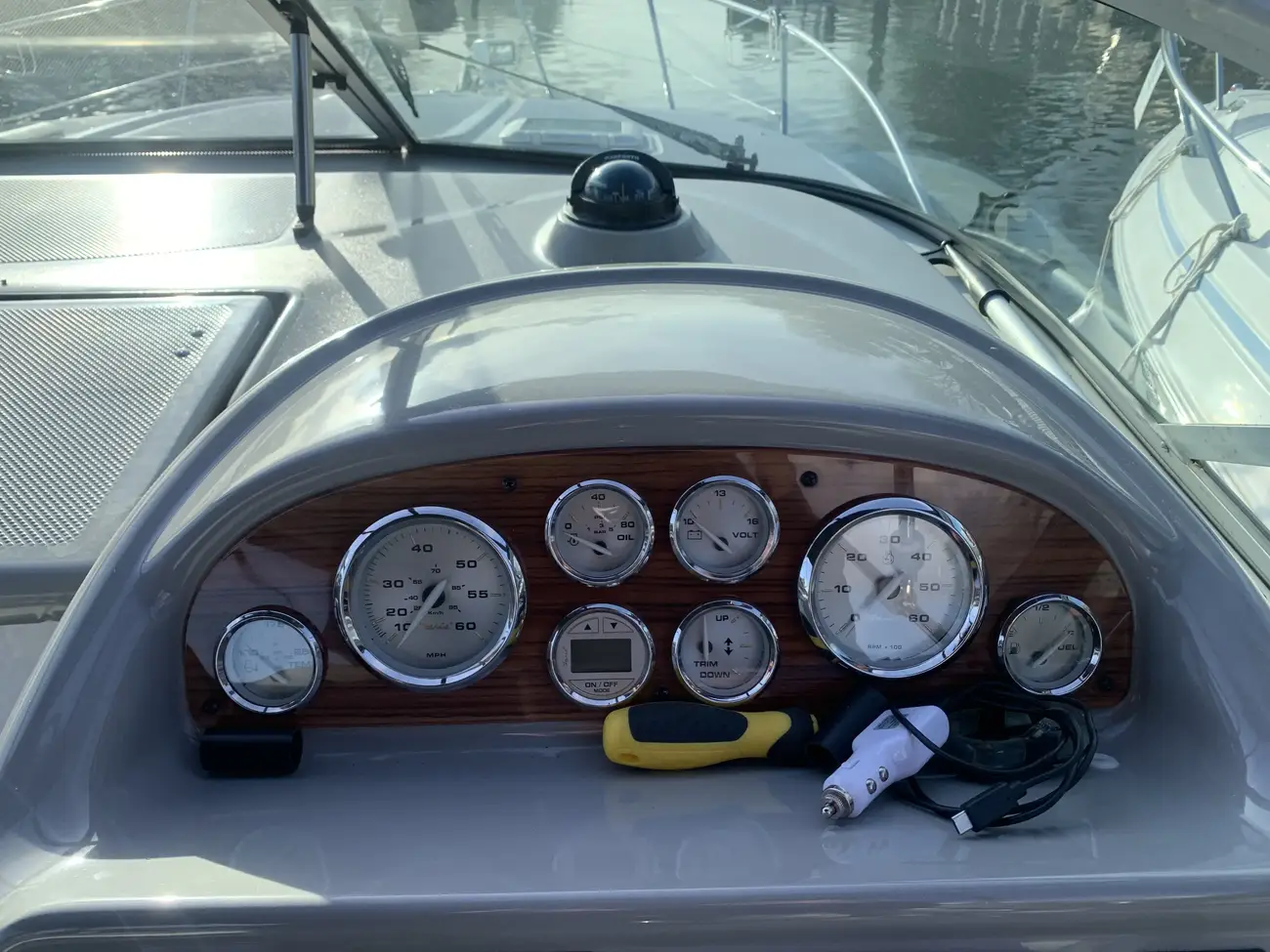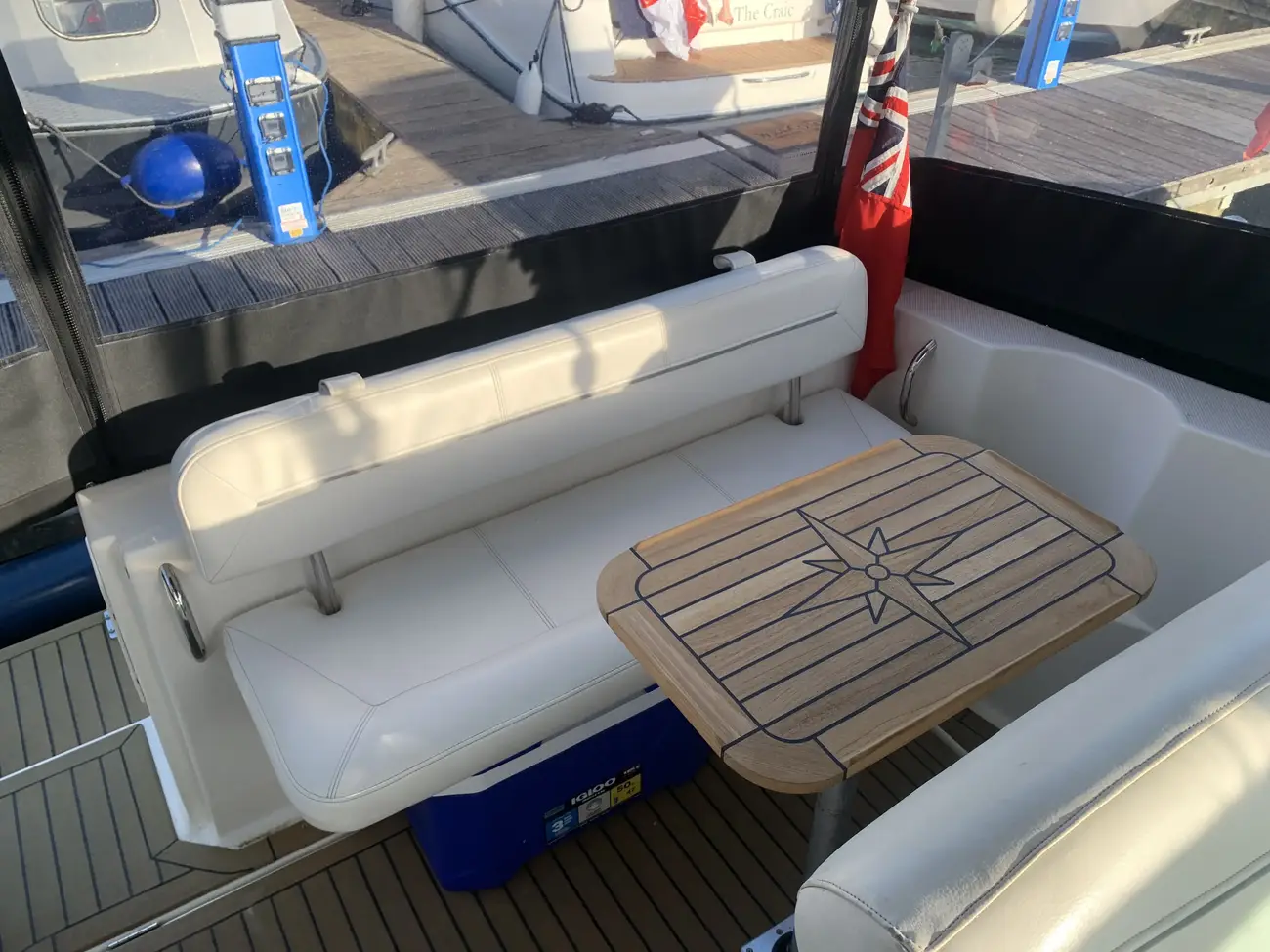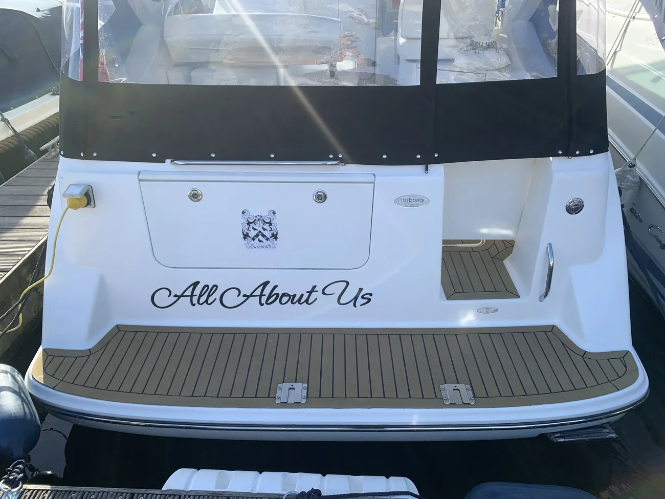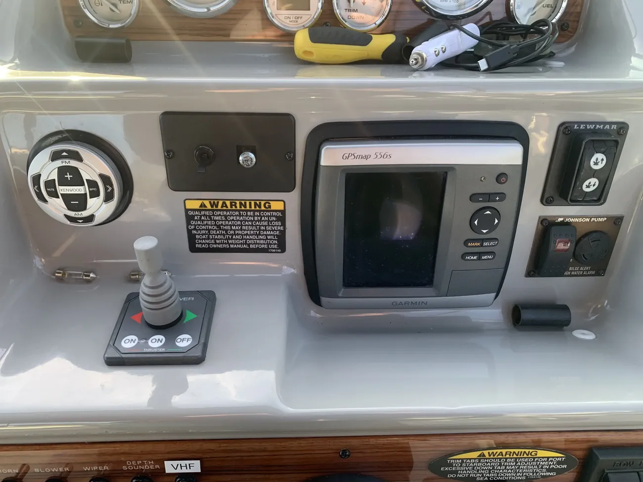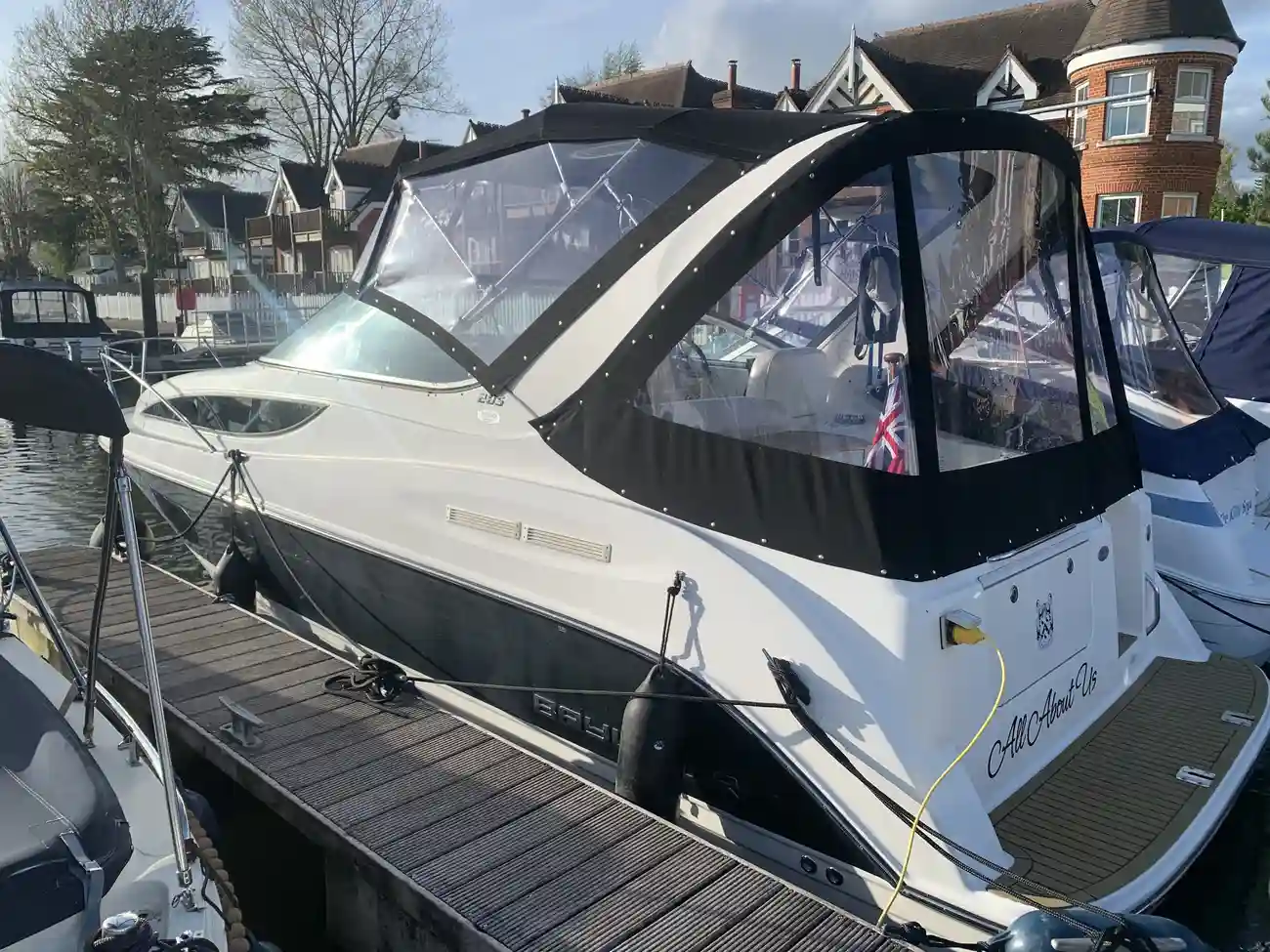 Further specification includes: bow thruster, Garmin GPSmap 556s, Garmin VHF 100i radio telephone, compass, horn, full engine instrumentation, trim tabs, electric bilge pump, Kenwood radio/stereo with speakers, teak cockpit table, cockpit drink holders throughout, Norcold fridge, Origo 2-burner hob, Contoure microwave oven, hot and cold pressurised water via calorifier, Kenwood DNX7200 navigation system, Sniper TV, Weems & Plath clock, electric flush toilet with waste tank, hot and cold pressurised water in head sink with pull out shower, teak effect flooring on bathing platform & cockpit, full adjustable cockpit canopy, Lewmar electric anchor windlass, anchor and chain, battery charger, full 240v shore support, spotlight, navigation lights, windscreen wiper, folding windscreen to bow, bathing ladder to water, shore power inlet, warps and fenders, fire extinguisher.
