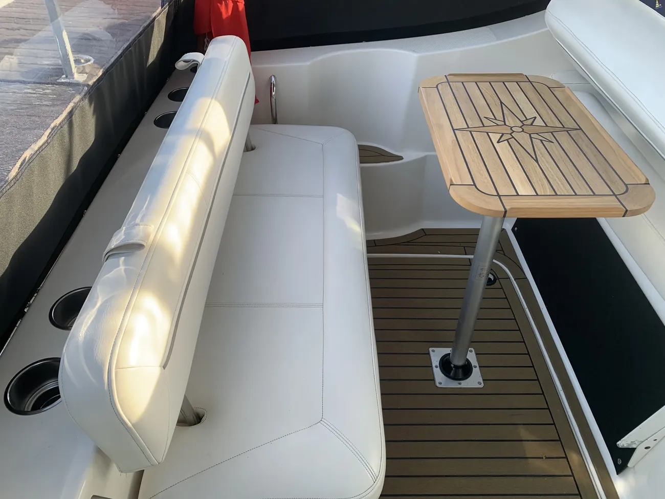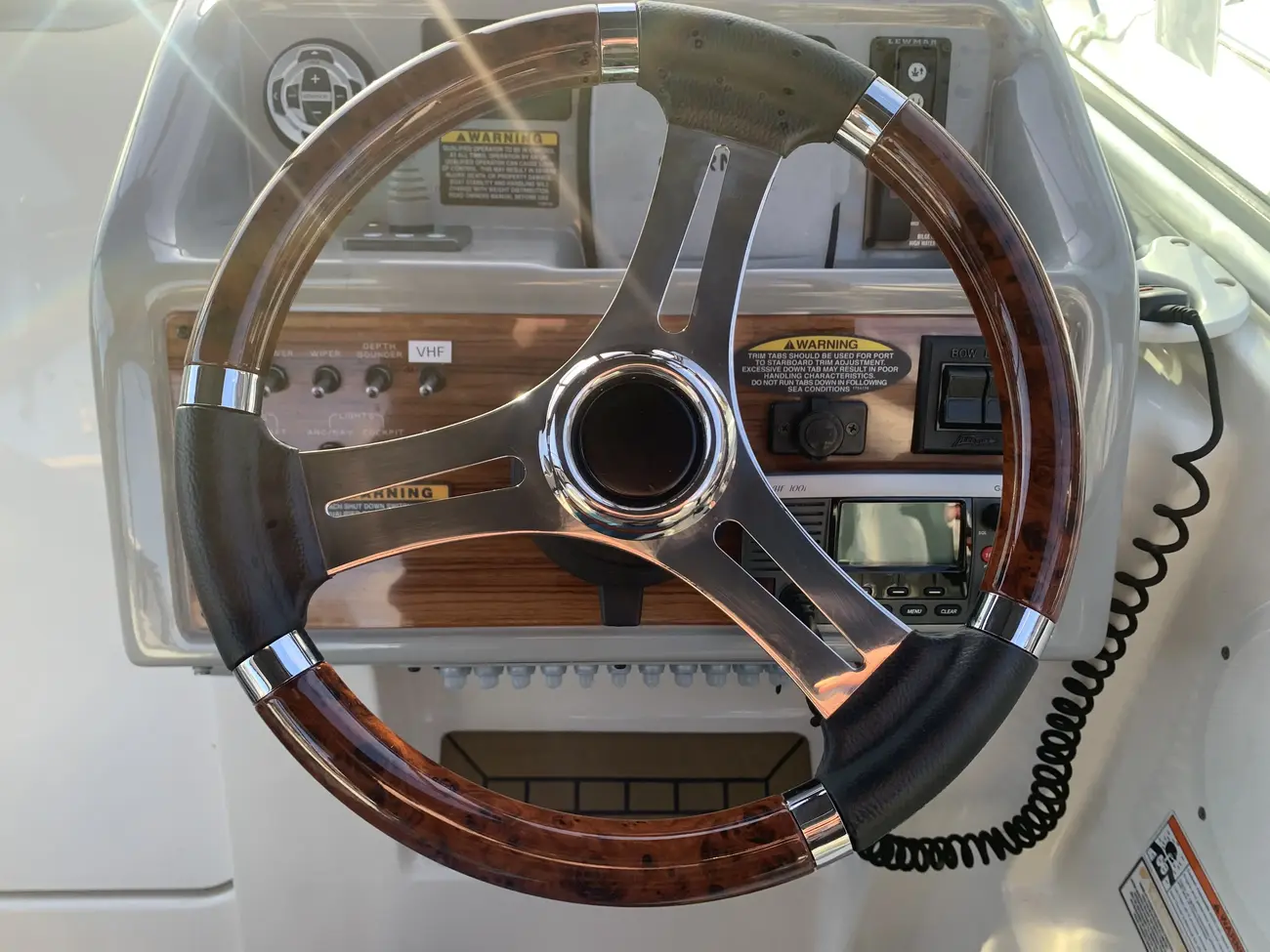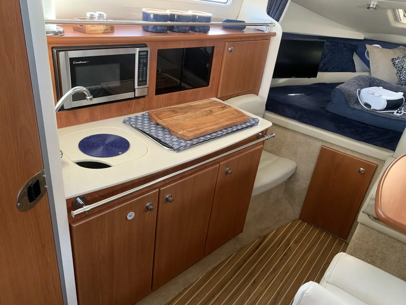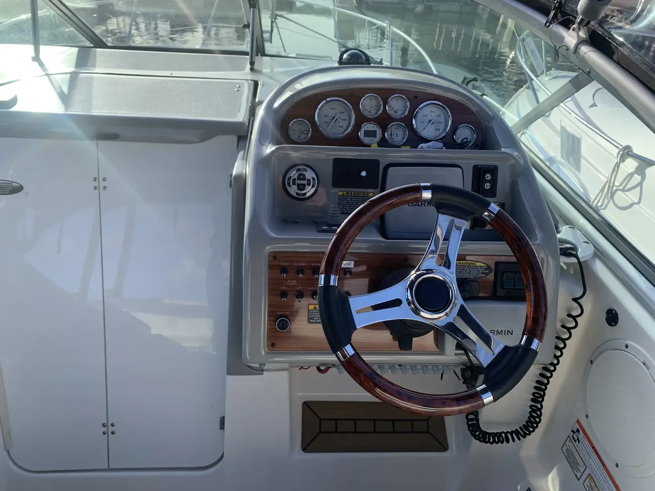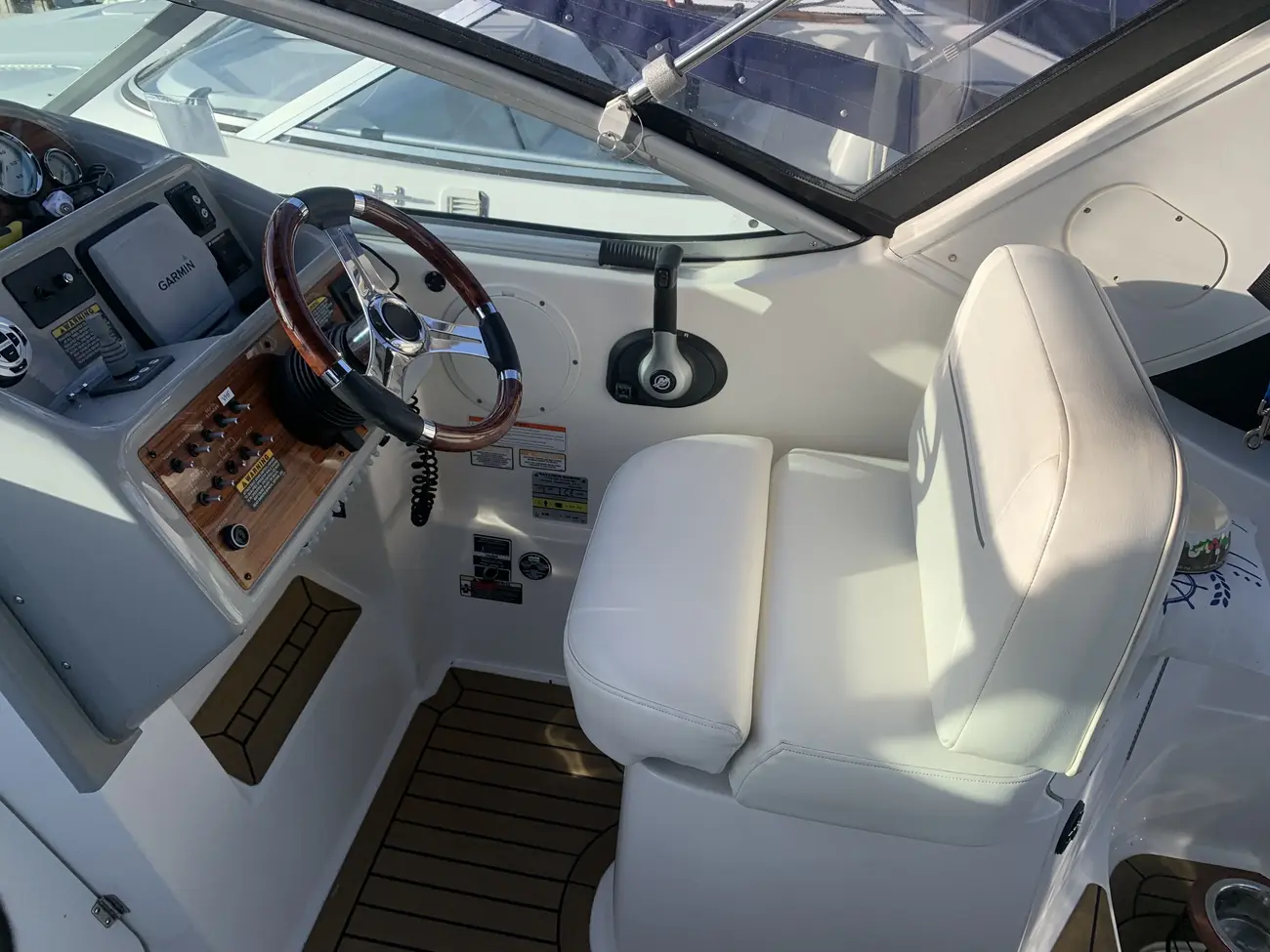Further specification includes: bow thruster, Garmin GPSmap 556s, Garmin VHF 100i radio telephone, compass, horn, full engine instrumentation, trim tabs, electric bilge pump, Kenwood radio/stereo with speakers, teak cockpit table, cockpit drink holders throughout, Norcold fridge, Origo 2-burner hob, Contoure microwave oven, hot and cold pressurised water via calorifier, Kenwood DNX7200 navigation system, Sniper TV, Weems & Plath clock, electric flush toilet with waste tank, hot and cold pressurised water in head sink with pull out shower, teak effect flooring on bathing platform & cockpit, full adjustable cockpit canopy, Lewmar electric anchor windlass, anchor and chain, battery charger, full 240v shore support, spotlight, navigation lights, windscreen wiper, folding windscreen to bow, bathing ladder to water, shore power inlet, warps and fenders, fire extinguisher.