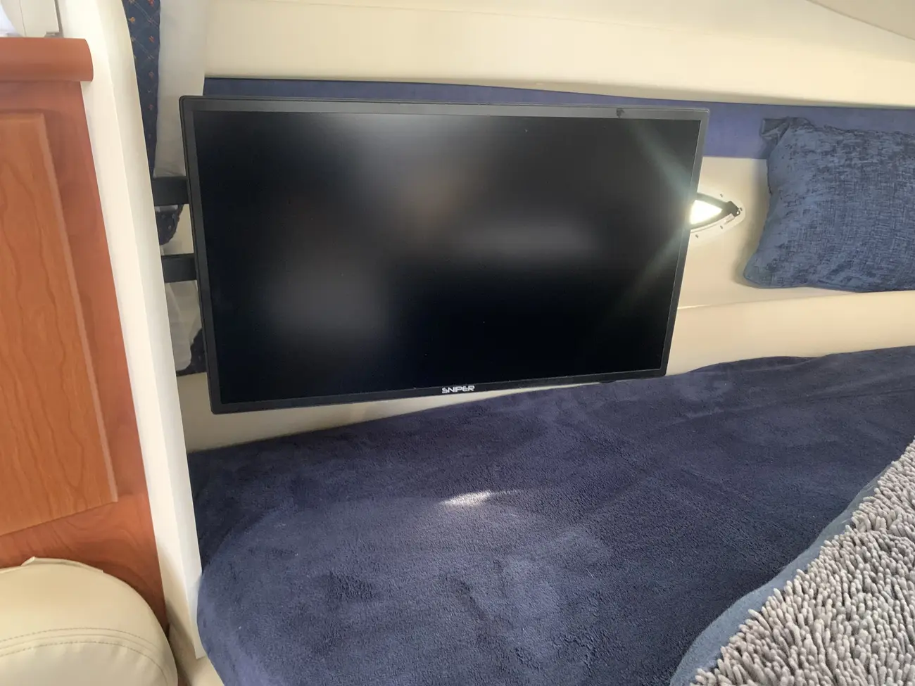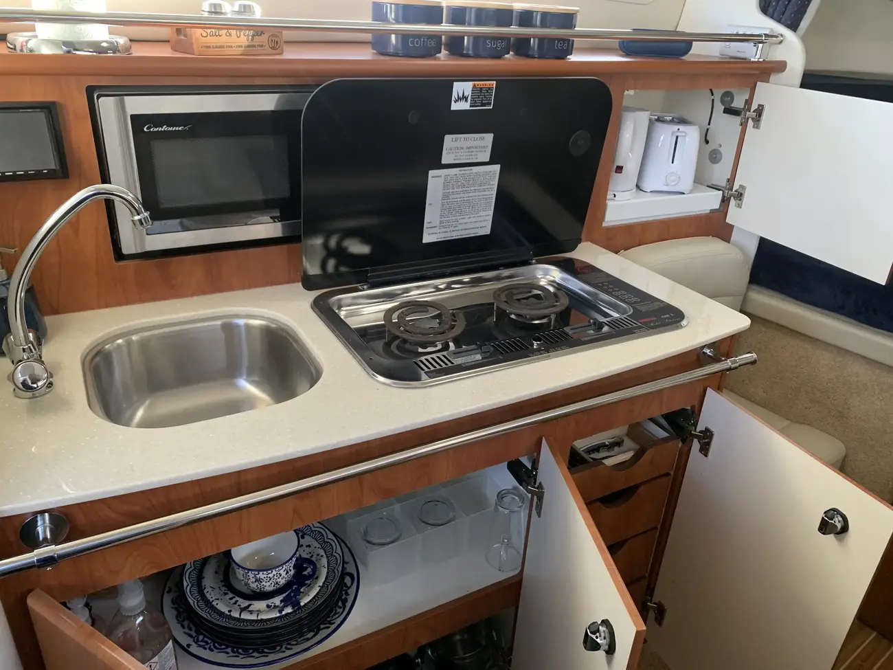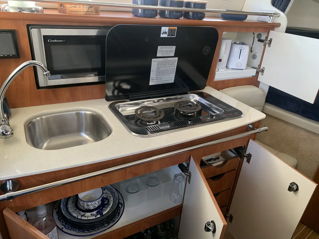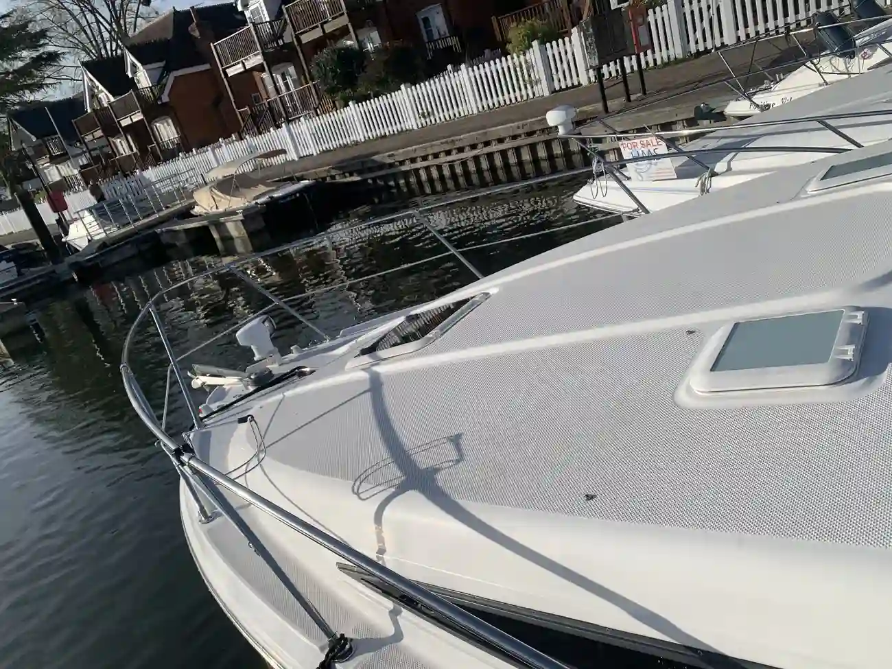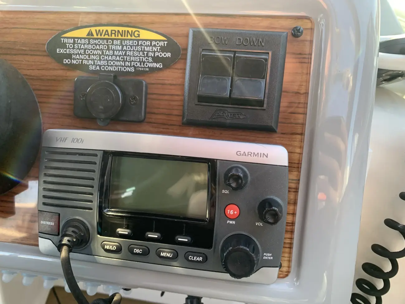 Further specification includes: bow thruster, Garmin GPSmap 556s, Garmin VHF 100i radio telephone, compass, horn, full engine instrumentation, trim tabs, electric bilge pump, Kenwood radio/stereo with speakers, teak cockpit table, cockpit drink holders throughout, Norcold fridge, Origo 2-burner hob, Contoure microwave oven, hot and cold pressurised water via calorifier, Kenwood DNX7200 navigation system, Sniper TV, Weems & Plath clock, electric flush toilet with waste tank, hot and cold pressurised water in head sink with pull out shower, teak effect flooring on bathing platform & cockpit, full adjustable cockpit canopy, Lewmar electric anchor windlass, anchor and chain, battery charger, full 240v shore support, spotlight, navigation lights, windscreen wiper, folding windscreen to bow, bathing ladder to water, shore power inlet, warps and fenders, fire extinguisher.