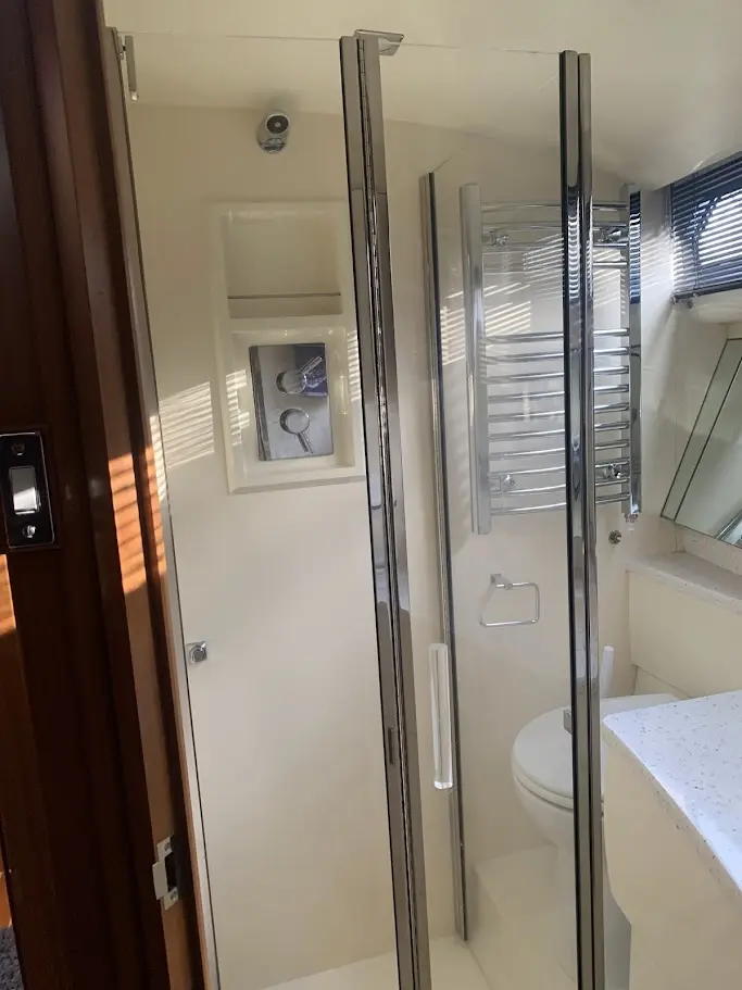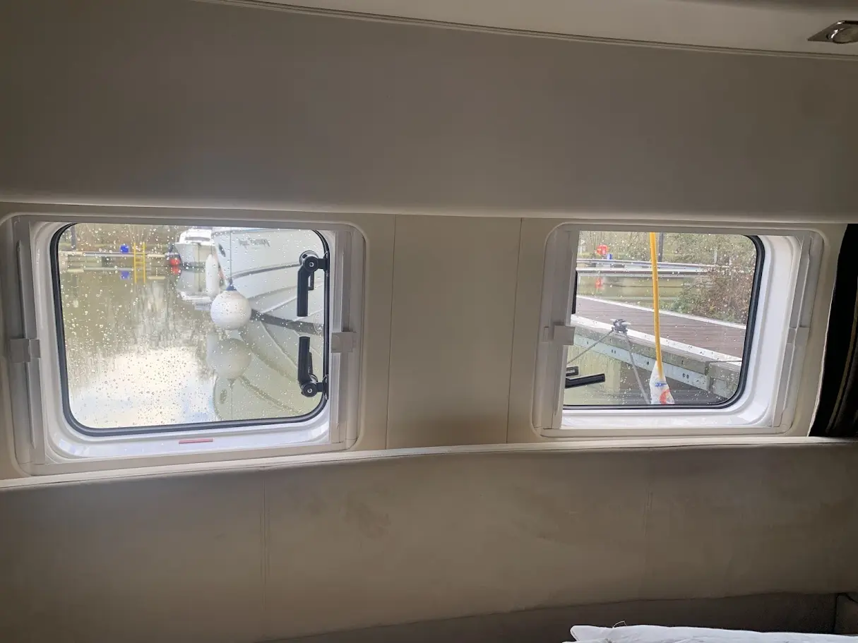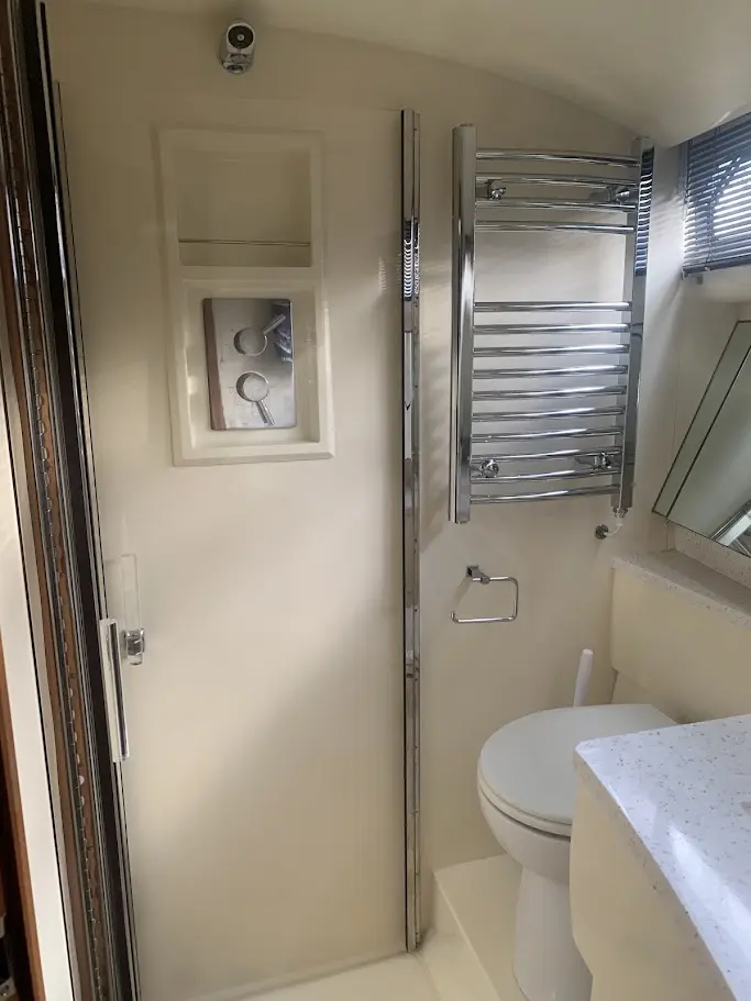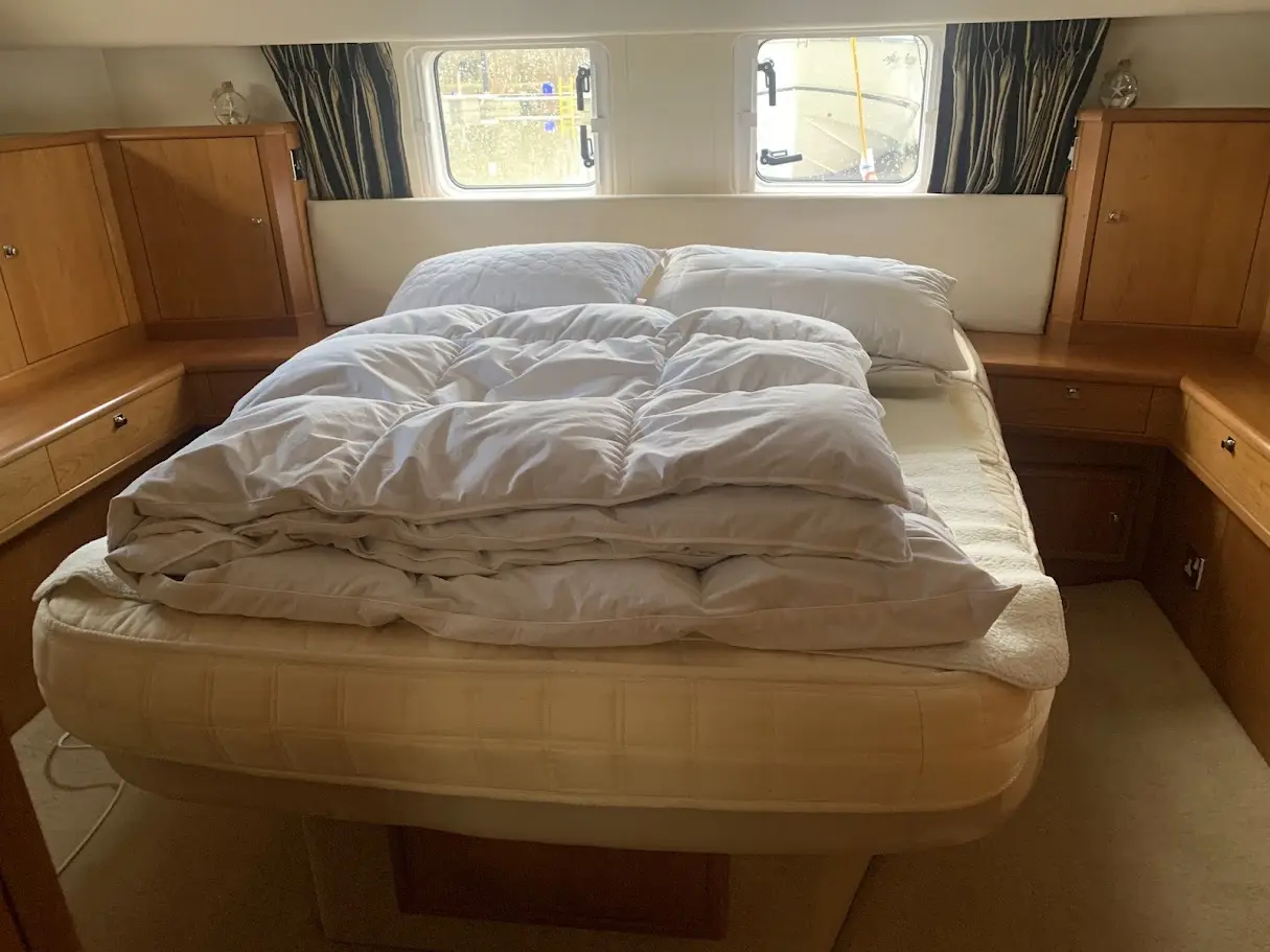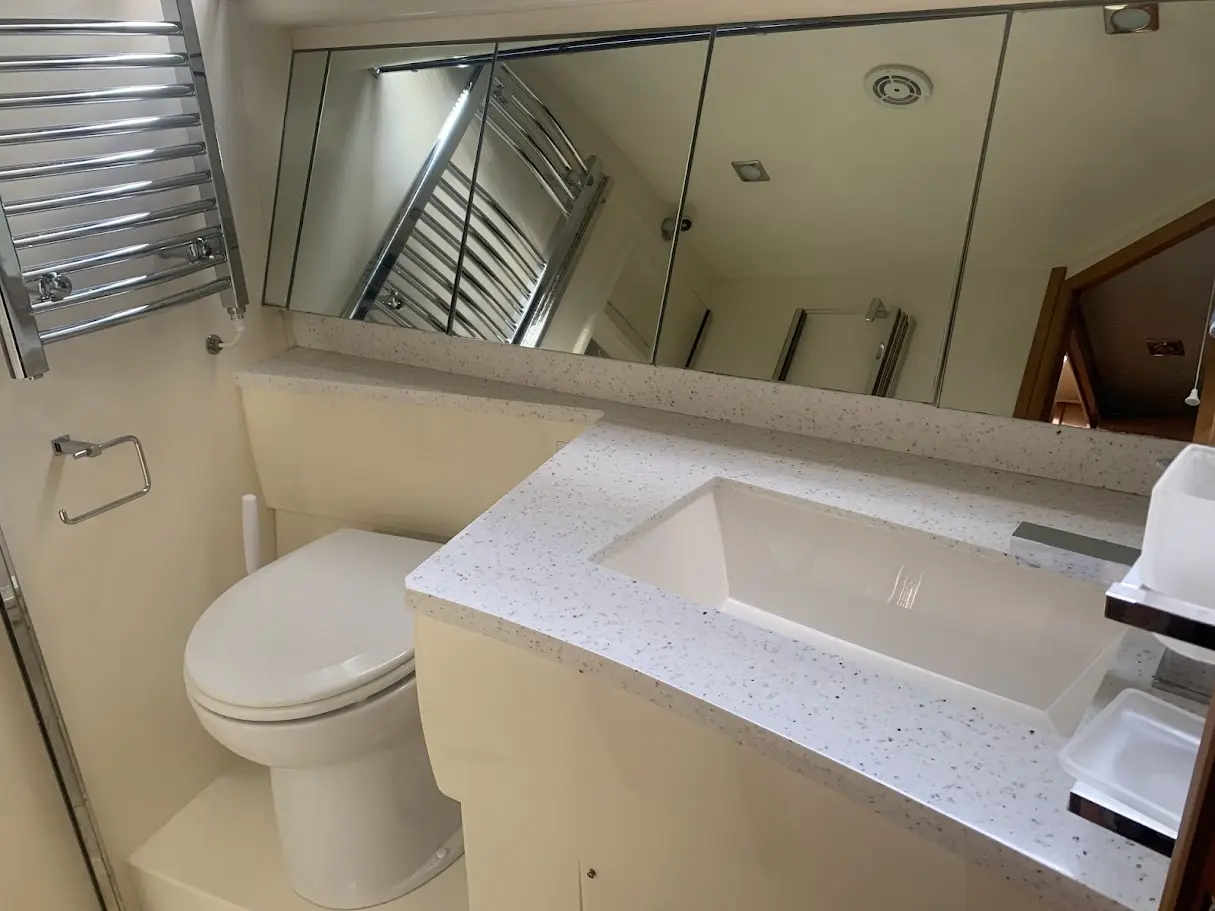 Aft Cabin: large double berth with storage underneath, Oceanair blinds fitted to 2x portholes giving complete blackout in the room, custom blinds and curtains throughout, huge amounts of cupboard/drawer storage, automatic lights in closets, control panel in closet, Eberspacher control panel, Cello TV on pull out bracket, USB charging points, LED lighting, seperate shower room with plenty of space, seperate head with electric flush toilet with waste tank and macerator discharge, heated towel rail in head, Corian worktop in head, LED lighting in head.