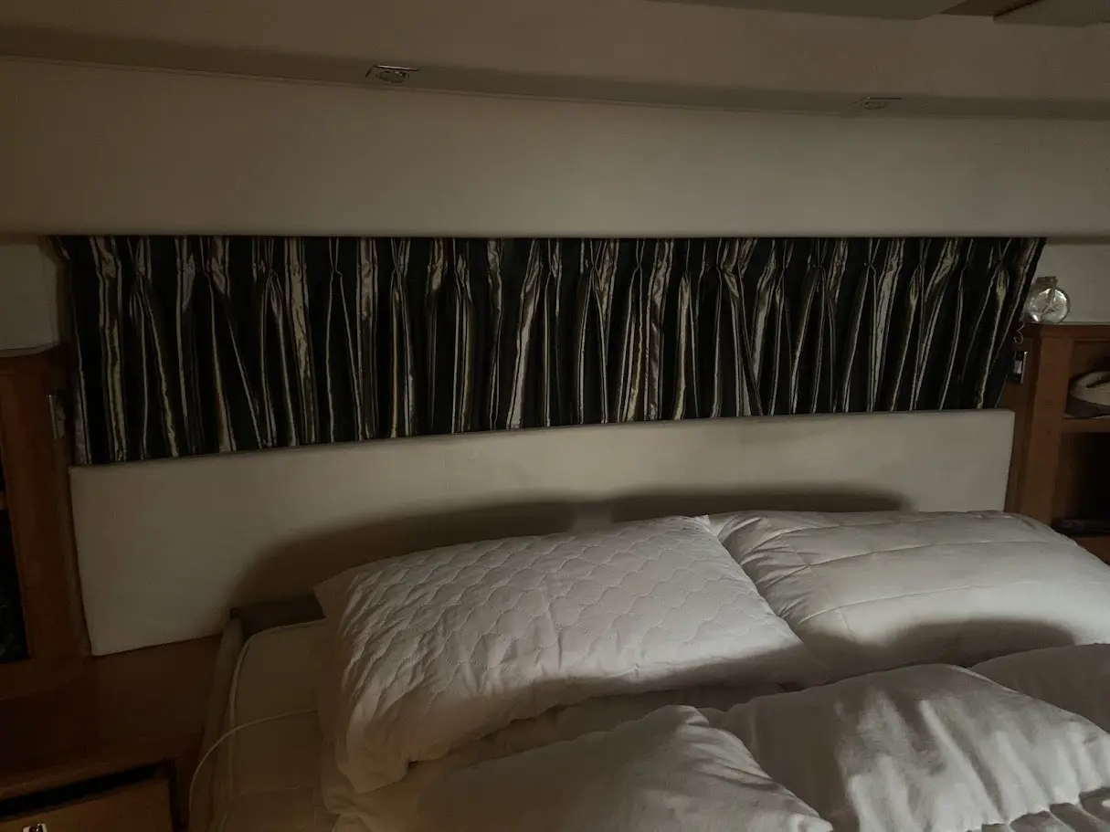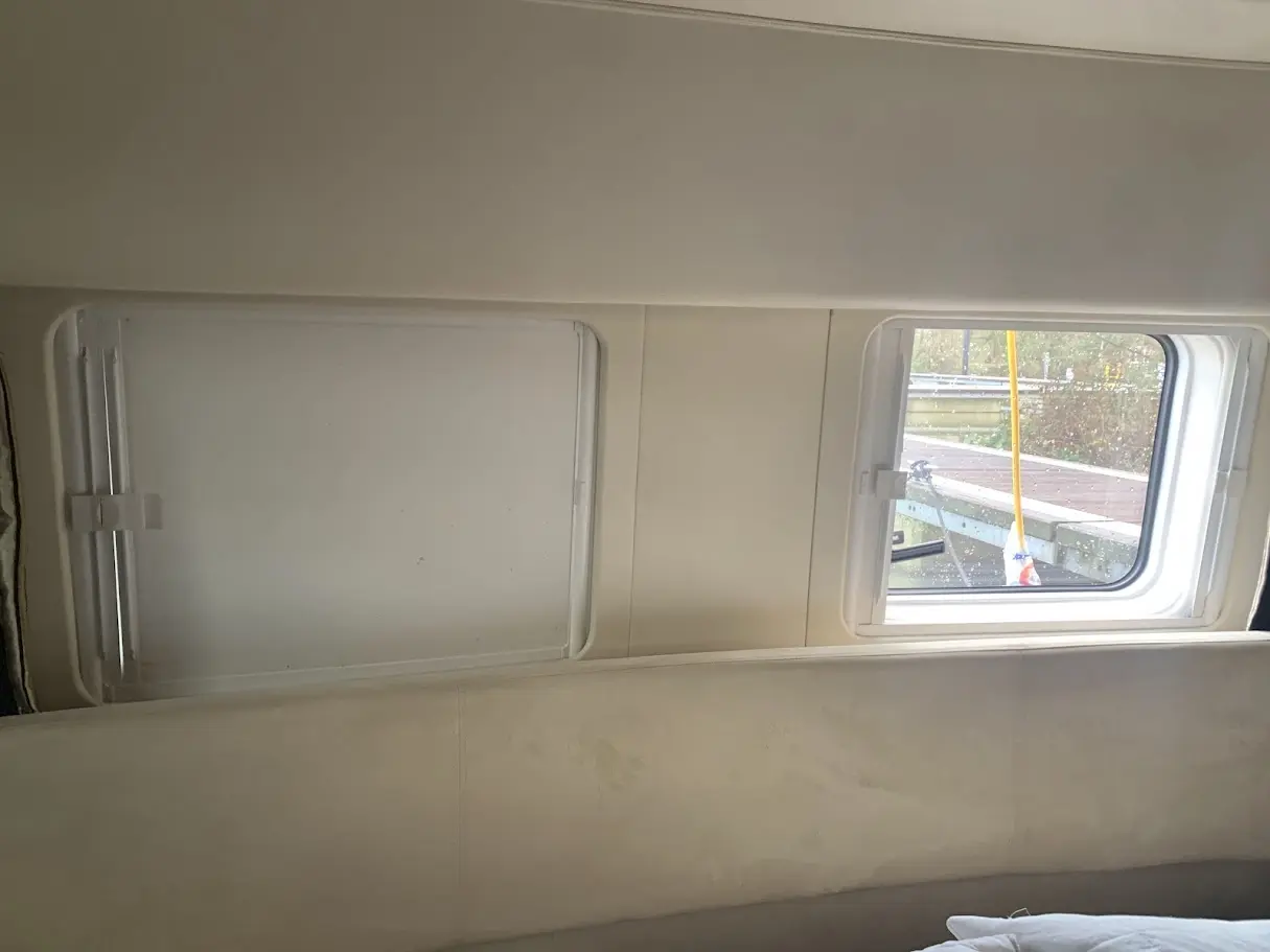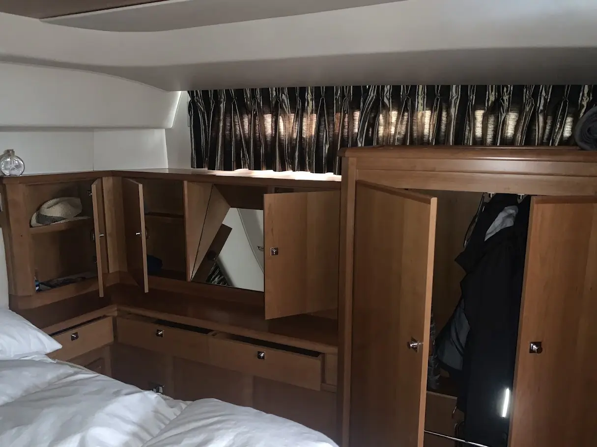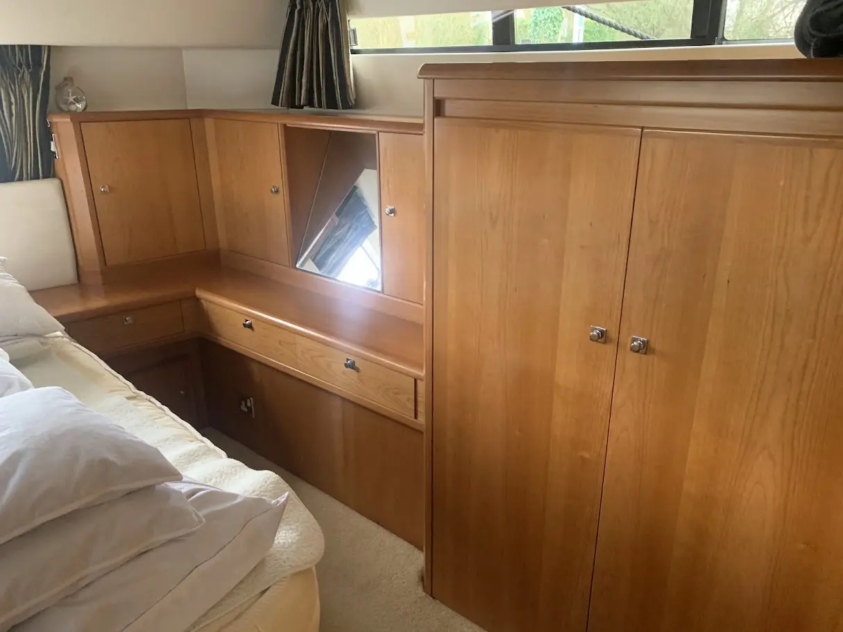 Aft Cabin: large double berth with storage underneath, Oceanair blinds fitted to 2x portholes giving complete blackout in the room, custom blinds and curtains throughout, huge amounts of cupboard/drawer storage, automatic lights in closets, control panel in closet, Eberspacher control panel, Cello TV on pull out bracket, USB charging points, LED lighting, seperate shower room with plenty of space, seperate head with electric flush toilet with waste tank and macerator discharge, heated towel rail in head, Corian worktop in head, LED lighting in head.
