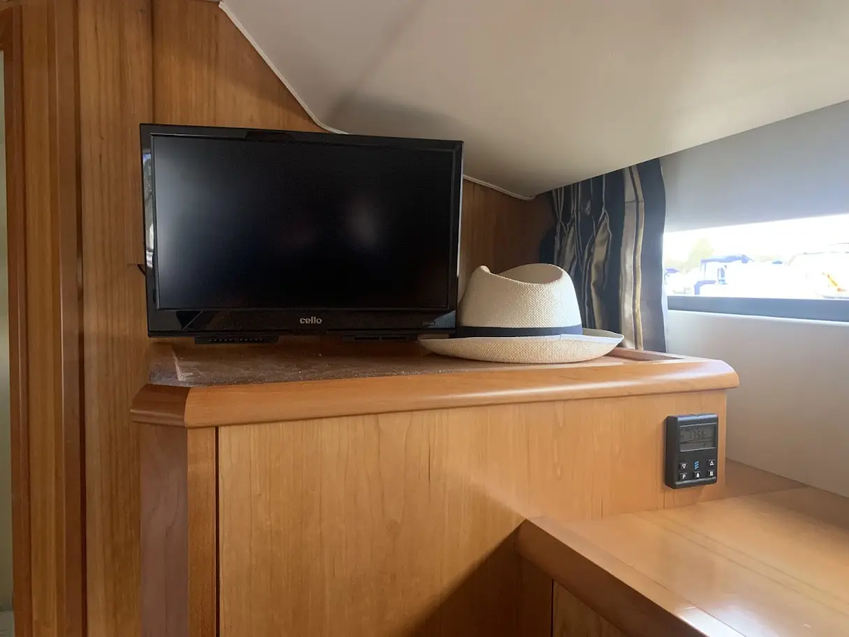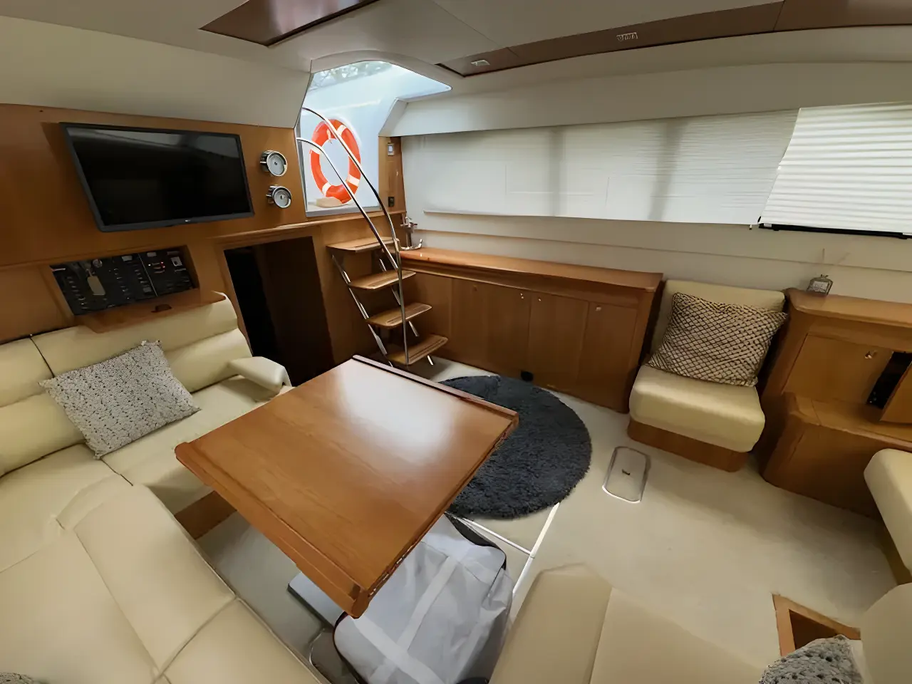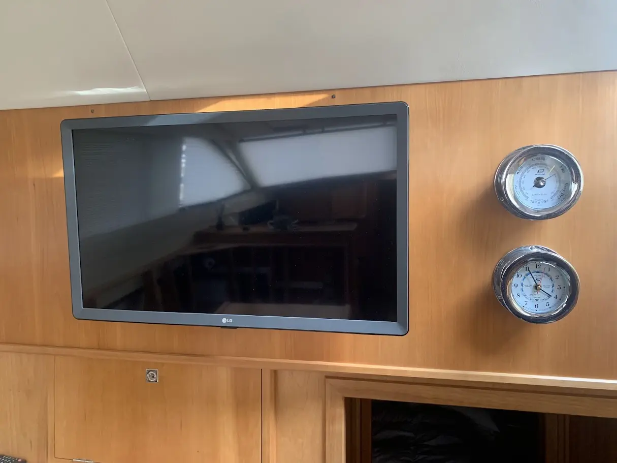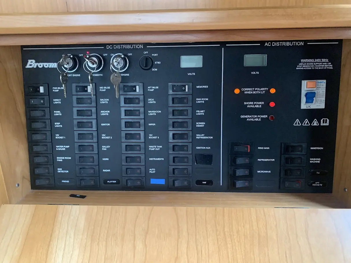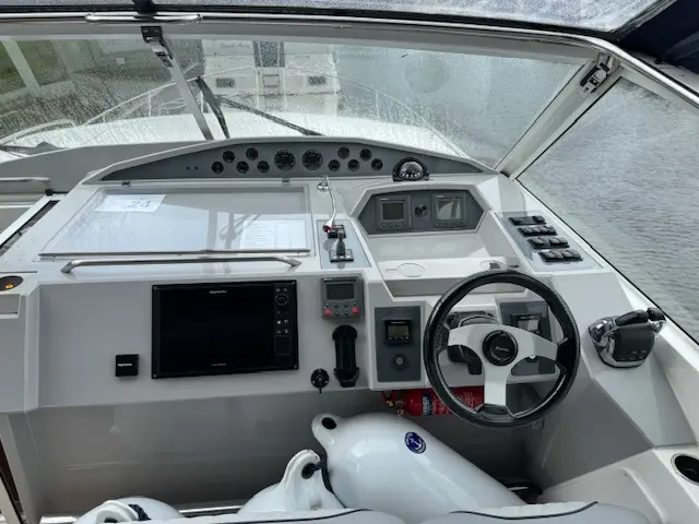 Navigation: Bow thruster, generator, RayMarine touch screen MFD (radar, plotter, GPS), hydraulic hinging radar arch, electric cruising controls, Plastimo barometer and clock, Bluetooth monitoring of boat temperature, bilge alarms, battery status etc, batteries, full engine instrumentation, helm instrument cover, horn, compass, Perspex chart table, chart table reading light, windscreen wipers.
