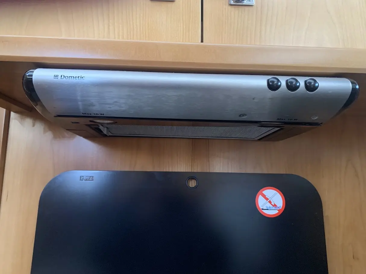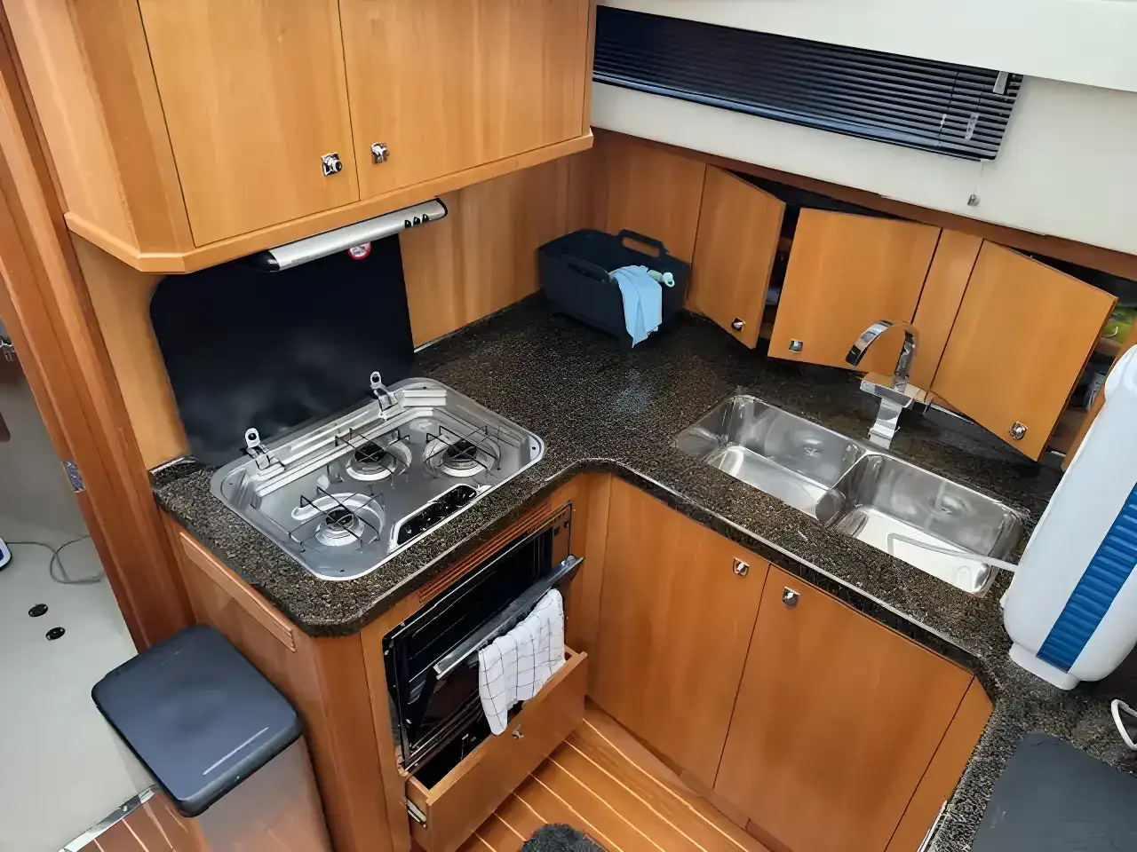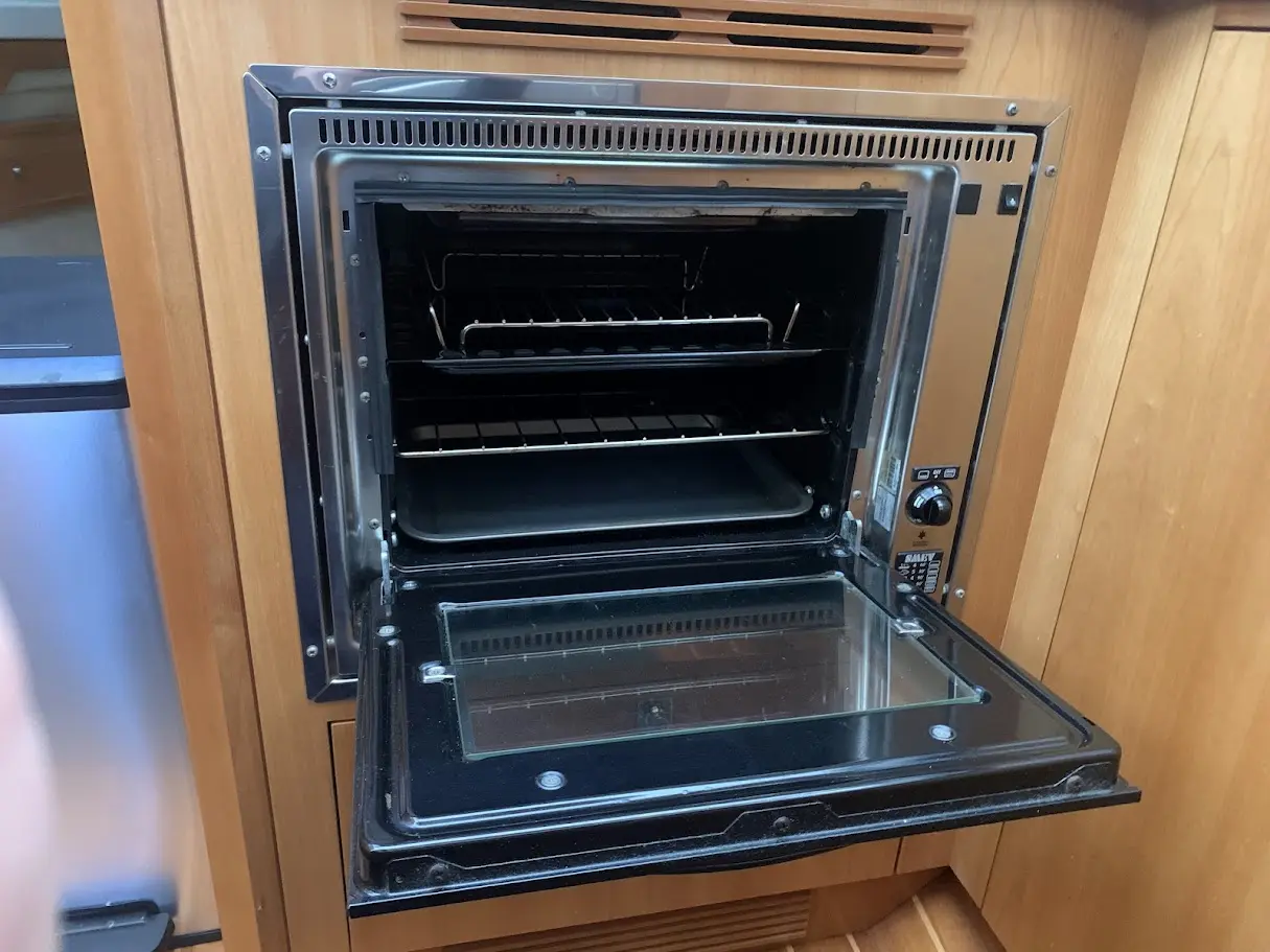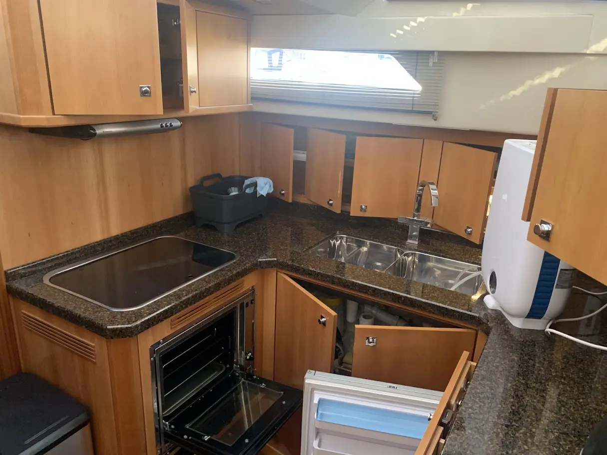 Galley: All electric galley, teak & holly laid floor, Smev 3-burner gas hob, Dometic extraction fan, Smev oven and grill, Sharp microwave, fridge with freezer compartment, large double sink, additional worktop piece to make double sink into single increasing worktop space, huge amount of storage including built in storage for additional worktop piece, automatic lights in kitchen cupboards, LED lighting, remote control gas shut off and alarm.