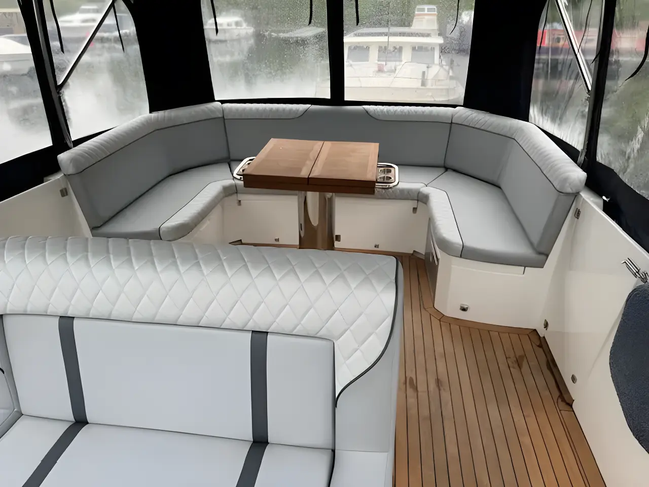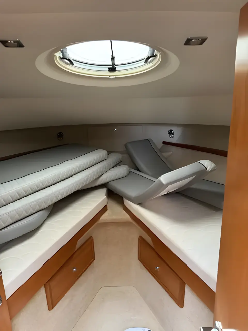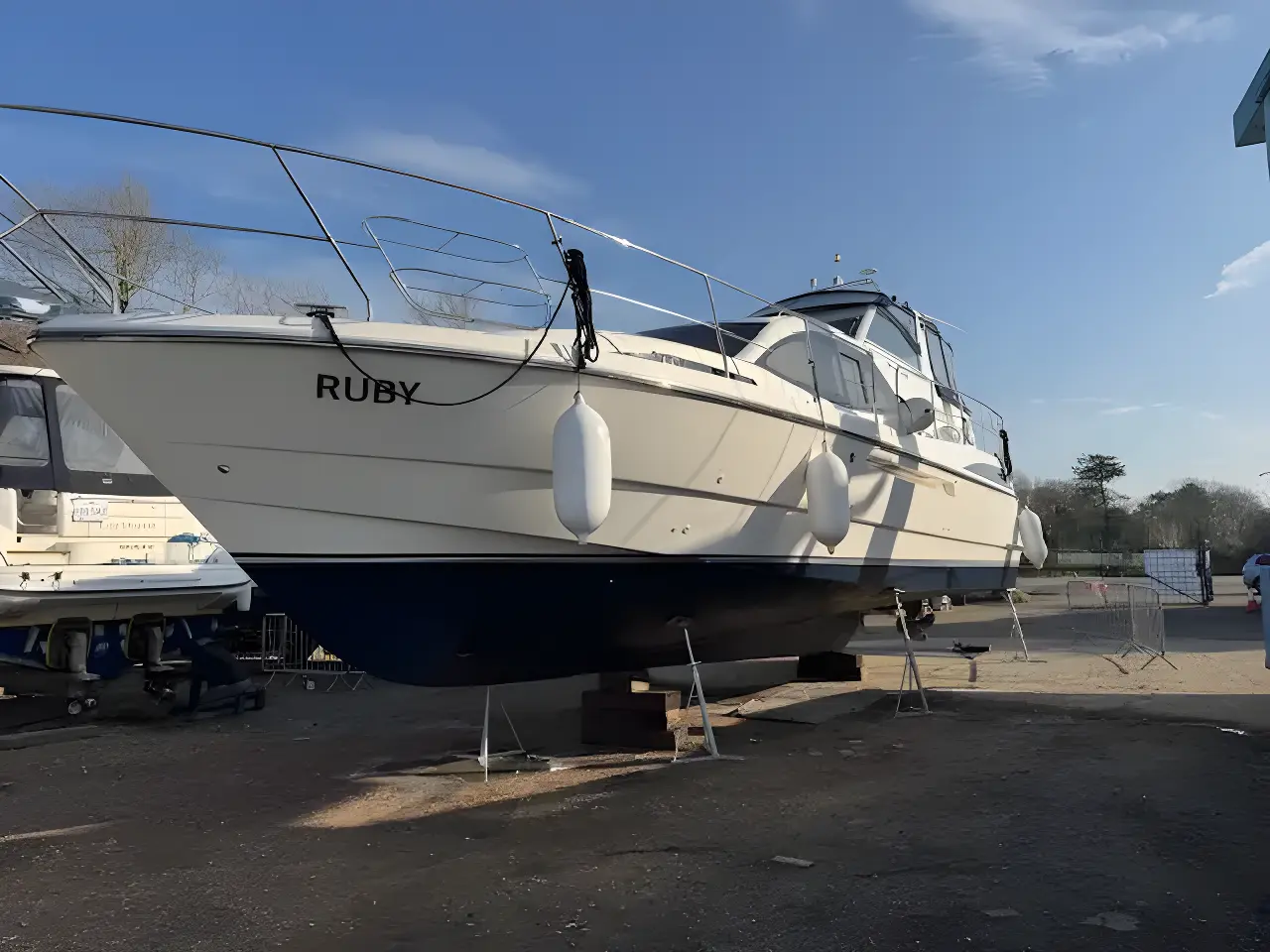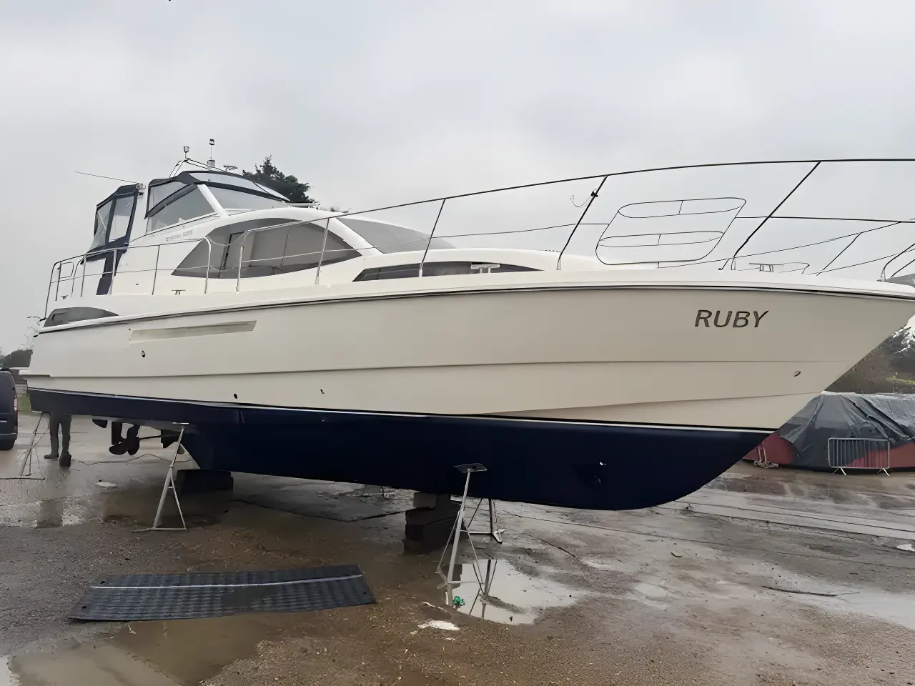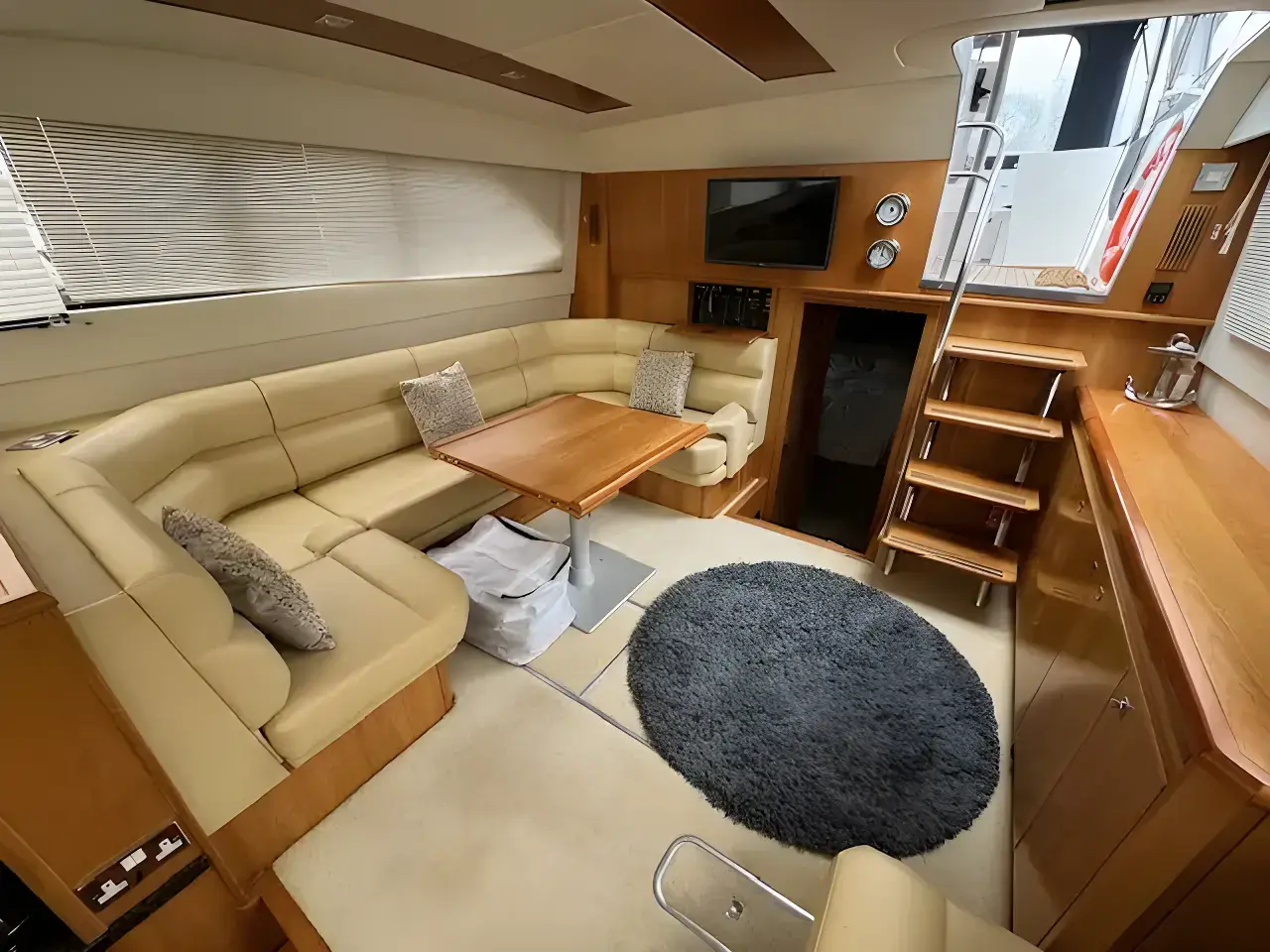 Recent upgrades from current owner include: custom reupholstered cockpit in a high premium fabric, illuminated transom name, Bluetooth monitoring of boat temperature, bilge alarms, battery status etc, new batteries fitted 2022, aft toilet pipes replaced and converted to fresh water flush, USB charging points fitted to each side of bed in aft cabin, saloon and helm, heads taps replaced, engine room fans replaced, engine and cabin fire extinguishers replaced, new horn, new prestige stainless steel and teak drop leaf cockpit table, new fenders, new cockpit fridge, LED lighting fitted to aft cabin, internal steps, galley & both heads, heated towels rails fitted to both heads, low level cockpit lighting fitted to match deck lights, new water pump, windscreen seals replaced, fuel tanks cleaned.