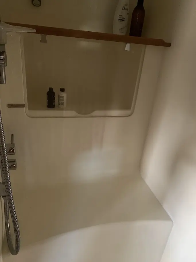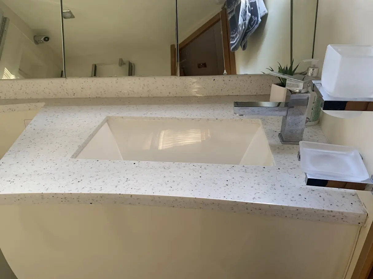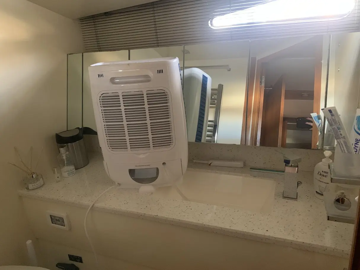 Day Head: electric flush toilet with waste tank and macerator discharge, foldaway shower doors, high quality Corian worktop, plenty of mirrors, heated towel rail, LED lighting.