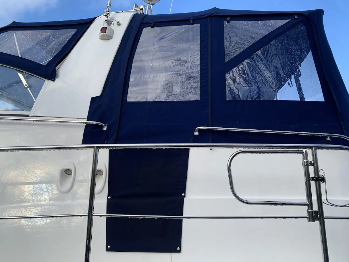 Exterior: full cockpit canopy in great condition, custom canopy cover on cockpit entryway, teak laid bathing platform & steps, illuminated transom name, low level deck lighting, stainless steel fender baskets, anchor and chain, stainless steel grab rails, navigation lights, warps and fenders.
