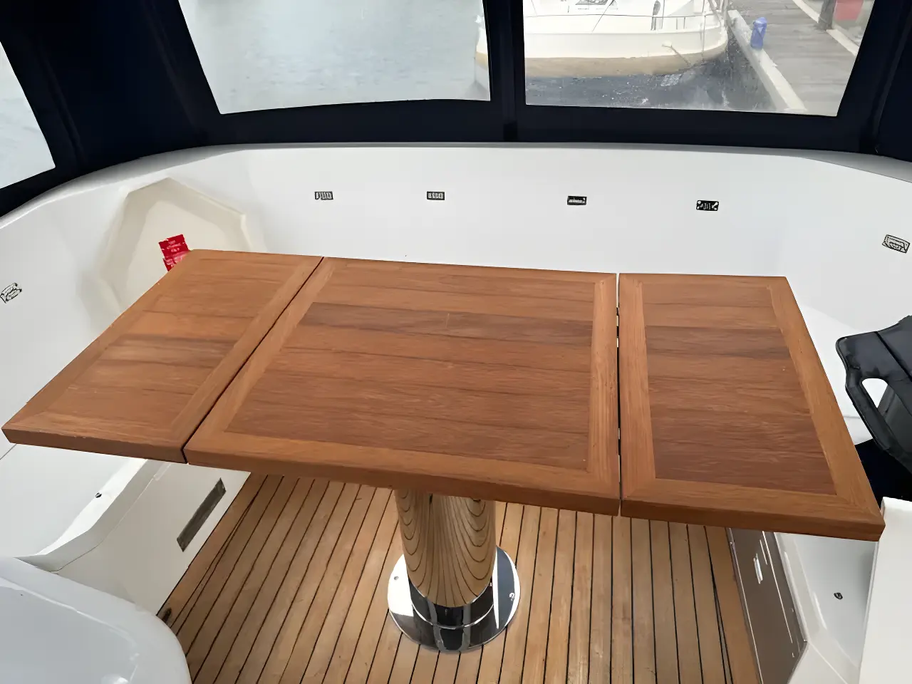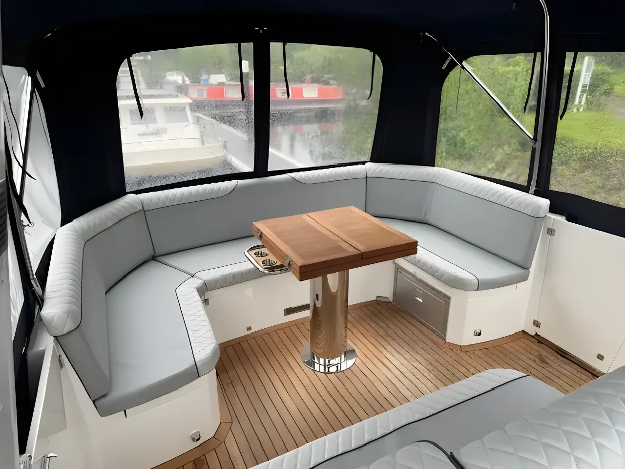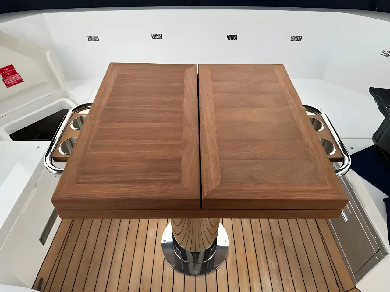 Cockpit: 2x Eberspacher central heaters, cockpit cushions in high premium fabric, prestige stainless steel and teak drop leaf cockpit table with drink holders, Isotherm drawer drinks cooler, teak laid cockpit, cockpit speakers, low level lighting to match deck, USB charging points.