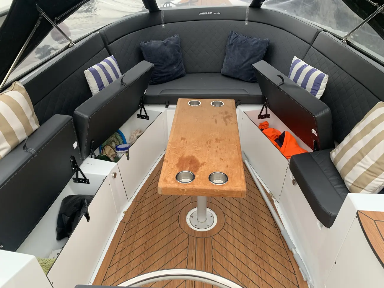 Manual and auto bilge pumps, horn, navigation lights, deck light, teak table, forward spray hood, full rear enclosure, bimini top, aft deck sun cushions, (all canopies and cushions in striking black colour), teak effect flooring and accents throughout, USB socket, cup holders, plenty of under seat storage, forward locker, stainless steel bathing platform ladder to water, stainless steel cleats and deck fittings, warps and fenders.