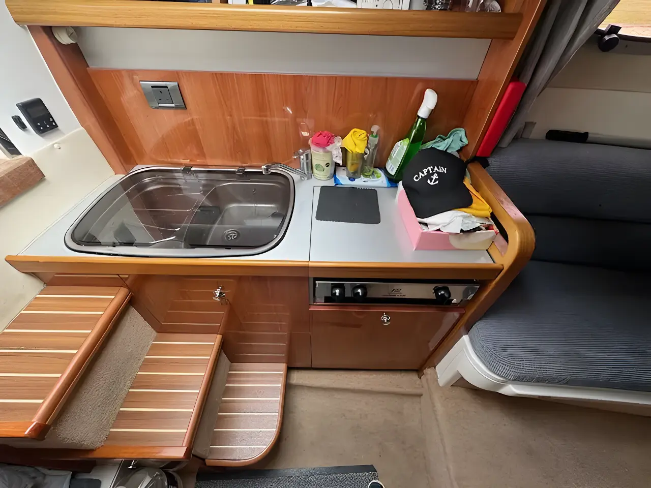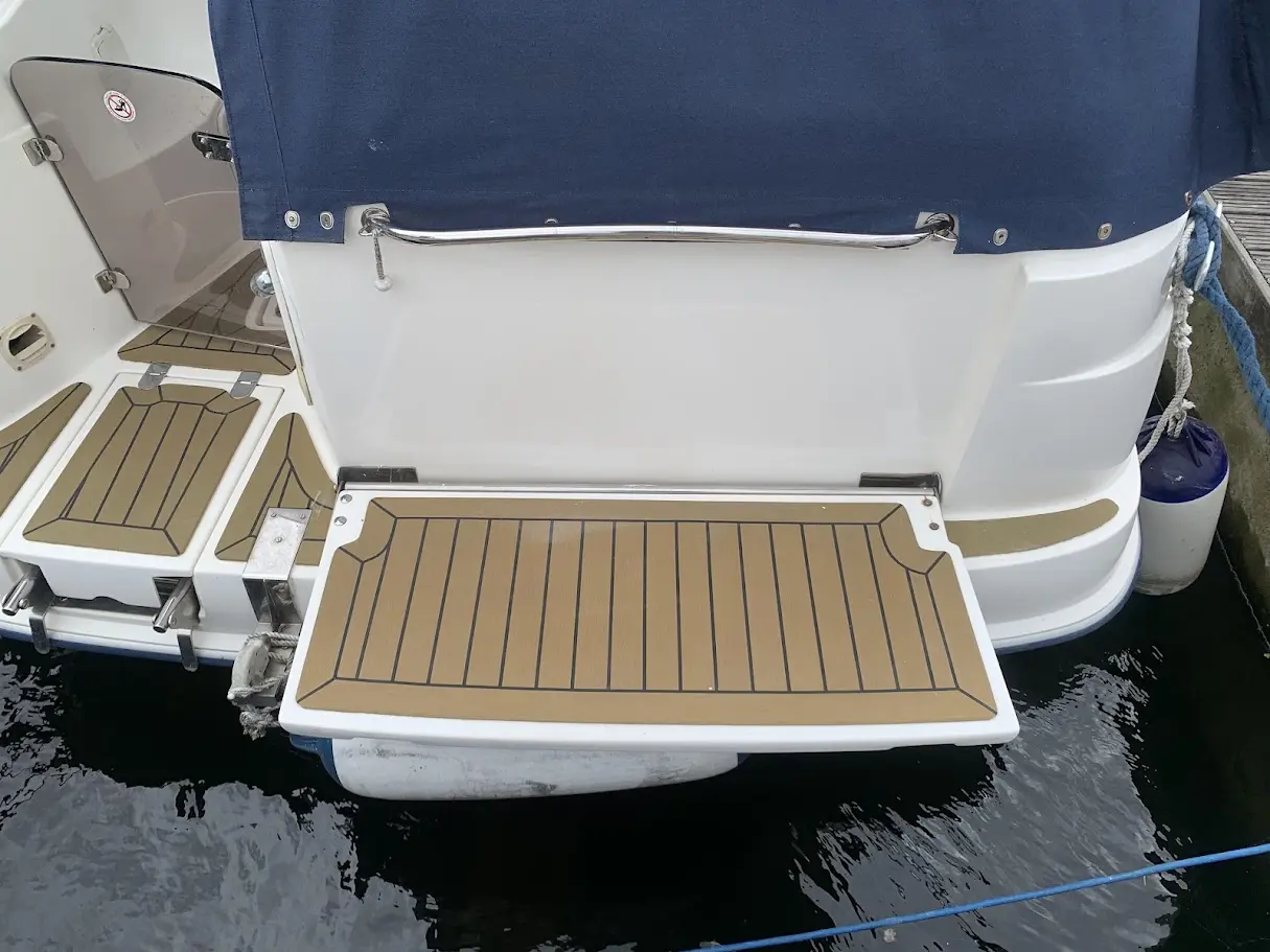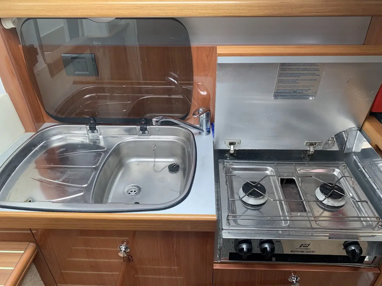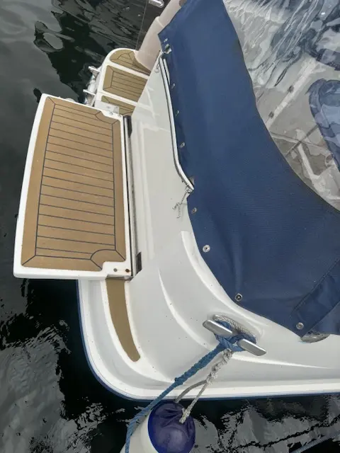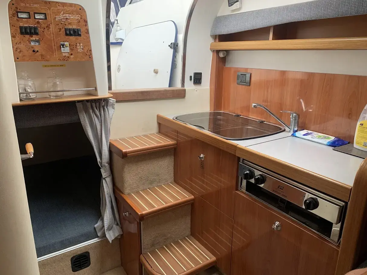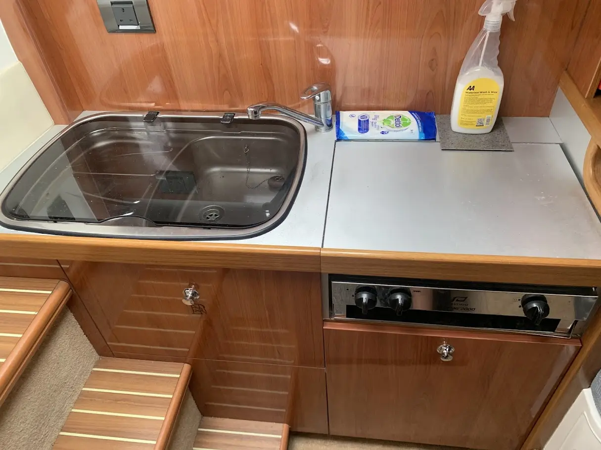 Further specification includes: RayMarine C70 multi functional display chart plotter, RayMarine Tridata Autohelm display (depth/speed/temp), M-Tech VHF radio, compass, Perspex chart cover, large stainless steel galley sink, Plastimo Neptune 2000 grill and double gas hob, heating, Kenwood bluetooth radio/CD with Sony speakers, Jabsco marine head, sink with pull out shower head, cockpit fridge, cockpit table, new marine cockpit and bathing platform flooring, extended bathing platform also with new marine flooring, full new canopy enclosure, windscreen wipers, navigation lights, transom shower, swimming ladder, stainless steel grab rails, fire extinguisher, warps and fenders.