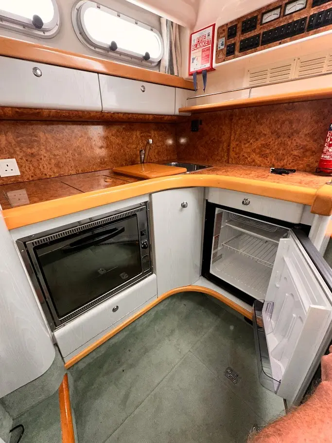 The S28 prioritizes safety with a full-width bathing platform, a concealed swim ladder, and a hot and cold shower for easy access to the cockpit. The saloon offers U-shaped seating with a dining table that seats seven, and the S28 provides four berths, including a mid cabin with ensuite access to the toilet/shower compartment.